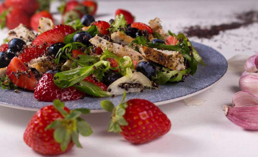 7. Пикантный ягодно-мясной салат с киноа готов к подаче на стол.