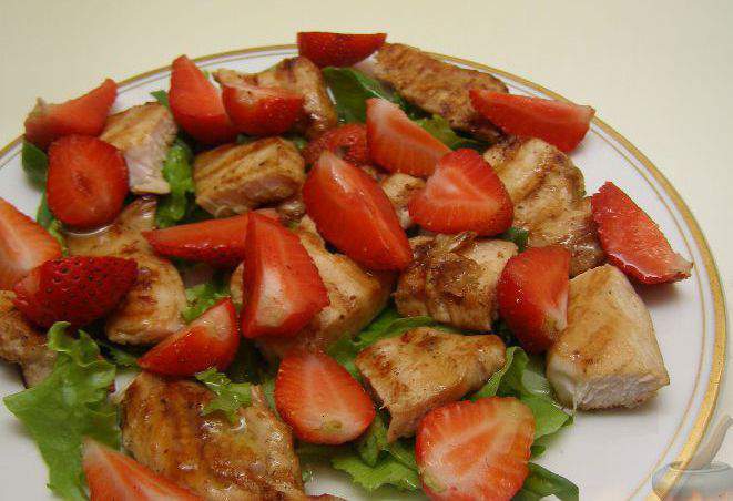 Сочетание поджаренного на гриле белого куриного мяса с ароматной сочностью красных ягод придает салату своеобразную экзотику. Салат отлично подходит для пикника или посиделок с друзьями. В дополнение можете добавить поджаренный кунжут или миндаль. Салат из указанного набора ингредиентов рассчитан на двух человек.