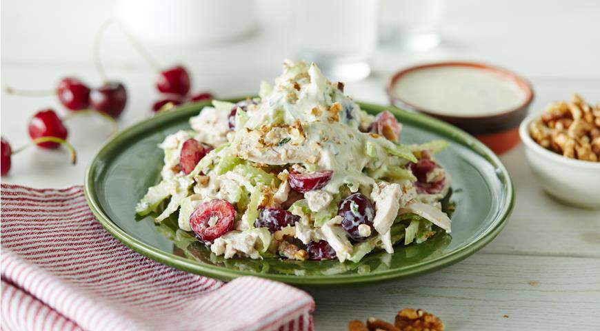 3. В просторной посуде смешайте курятину с измельченными орехами, черешней и сельдереем.
