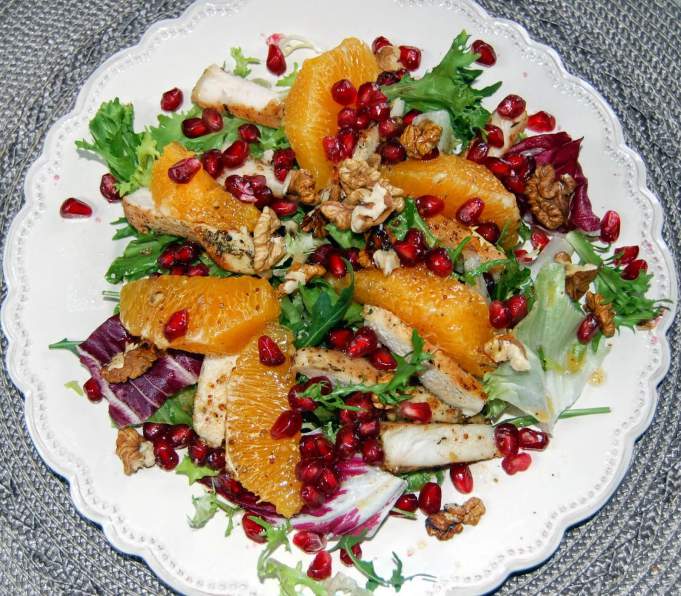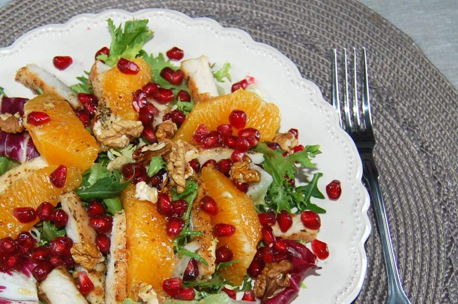 8.Салат из курятины с апельсинами и гранатом готов. Подавайте его сразу после приготовления со свежим багетом или черным хлебом.