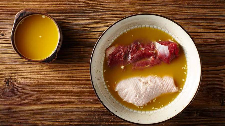 2. Замаринуйте мясо. Для этого приготовьте маринад. Очистите зубчик чеснока, нарежьте его тонкими мелкими ломтиками, добавьте все остальные ингредиенты маринада, залейте им утятину в миске и поставьте на несколько часов в холодильник.