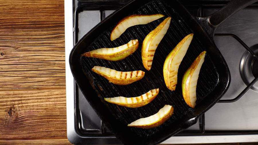5. Поджарьте грушу на гриле. Тщательно вымойте плод, разрежьте вдоль пополам, удалите семена с семенным гнездом, а затем разрежьте каждую половинку на 4 дольки, получая всего 8 долек. Слегка поджарьте дольки груш на сковороде гриль с обеих сторон.