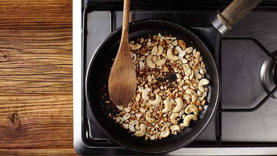 6. Поджарьте орехи кешью на сухой сковороде. Приготовленную свёклу очистите от кожуры, и нарежьте половинками кружков.