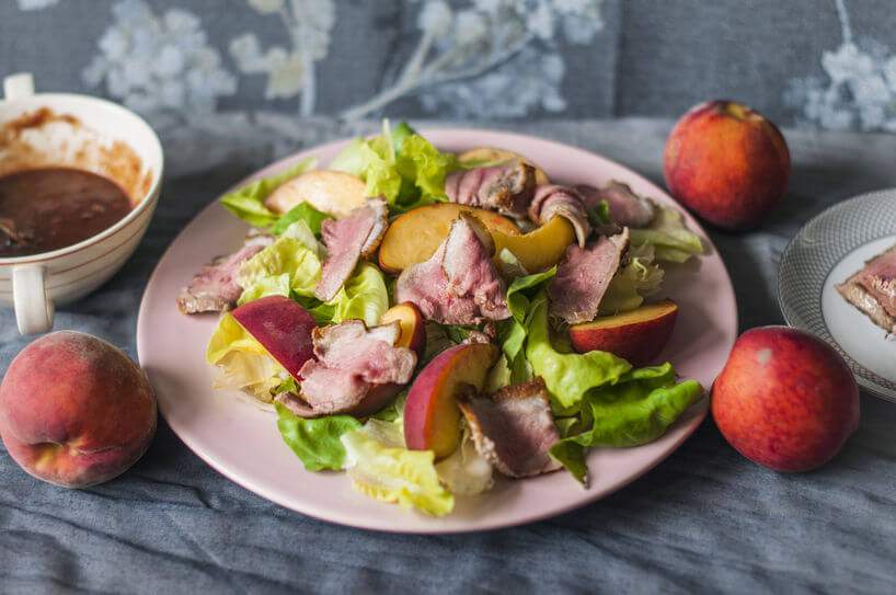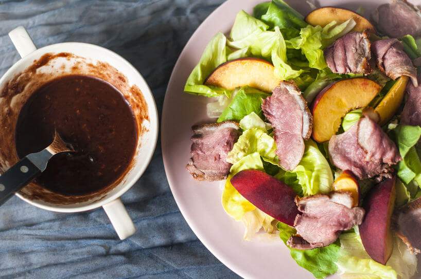9. Тёплый салат из утки с персиками и сливовым соусом – отличное дополнение к обеду или сытный самодостаточный ужин для семьи.