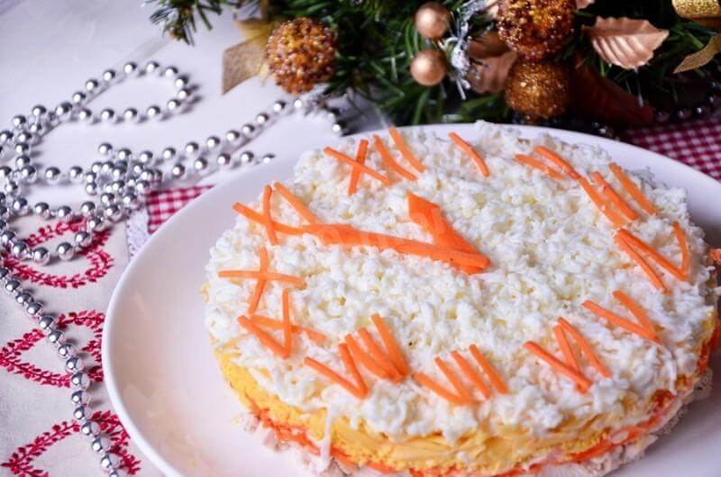 Салат «Новогодние часы» из куриного филе, сыра и корейской моркови