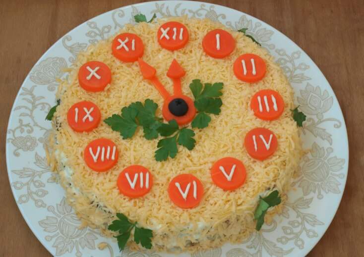 6. Сыр натрите на крупной или мелкой терке, посыпьте им верх и бока салата. Сделайте циферблат из кружков вареной моркови, из нее же вырежьте и уложите стрелки, «закрепив» их надрезанной оливкой.
