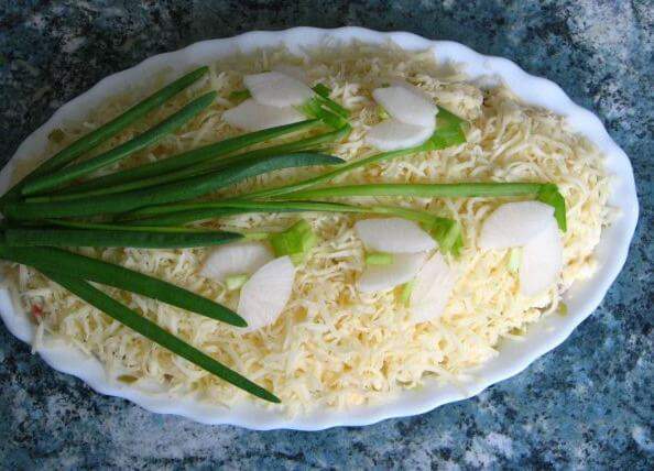 5. На верхний слой тертого сыра выложите стебли зеленого лука, ошпаренного кипятком, это будут листья подснежников. Лепестки цветов вырежьте из оставленного яичного белка и разложите на салате как цветы.