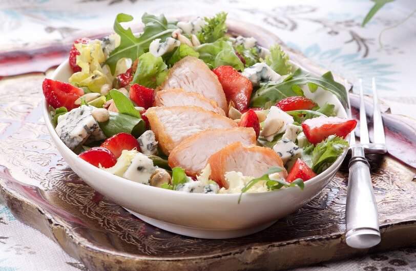 Готовим салат с курицей, клубникой и сыром с плесенью
