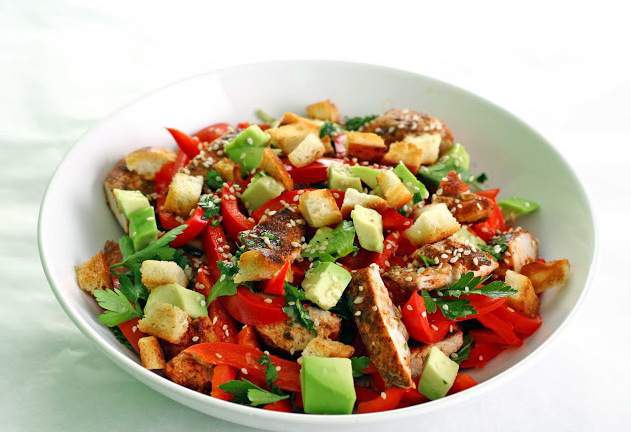8. Разложите на тарелки листья салата, на них выложите ломтики курицы, перец, авокадо. Залейте салат соусом, добавьте сверху гренки и посыпьте кунжутом.