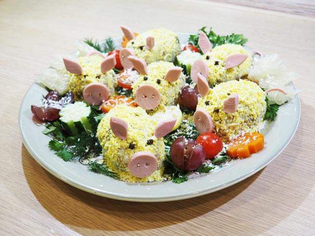 7. Выложите комочки салата на большое плоское блюдо и обсыпьте со всех сторон тертыми желтками. Из тонких ломтиков вареной колбасы вырежьте уши, пятачки и хвостики, прикрепите к тушкам с помощью зубочисток..