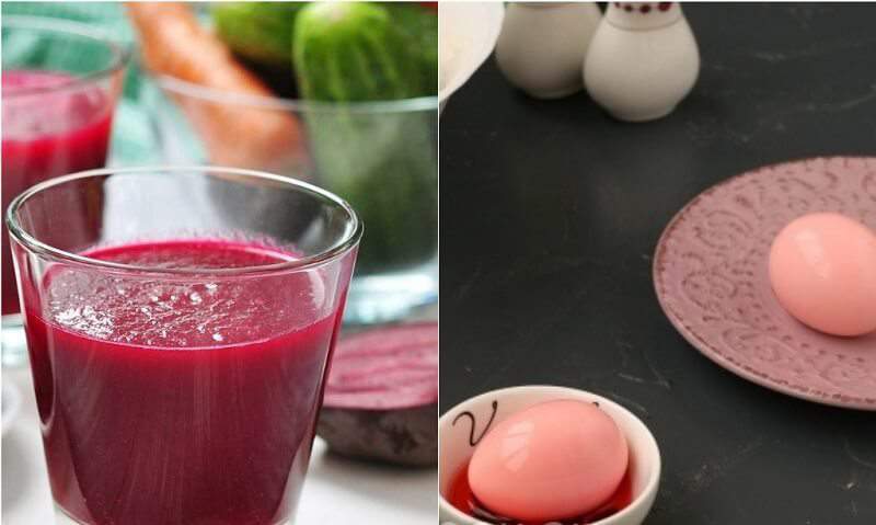 5. В небольшую емкость налейте немного воды, разведите в ней немного свекольного сока или пищевого красителя. В полученный раствор опустите вареные яйца и покрутите для получения равномерного окраса.