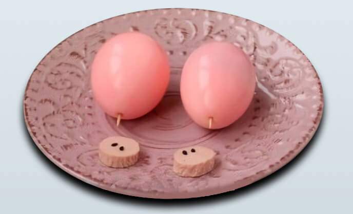 7. Каждое окрашенное яйцо проткните вдоль по центру зубочисткой, чтобы были видны острые концы для крепления пятачка и хвостика. Вырежьте из колбасы круглые пятачки, треугольные ушки и хвостики.