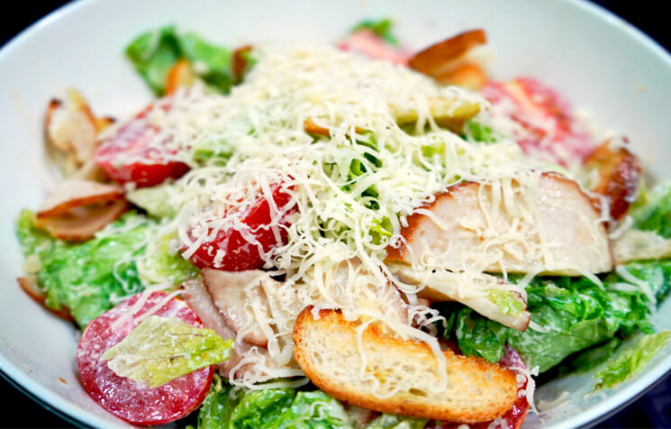 Салат з індичкою та сирним соусом готується швидко та просто, тому що в ньому використовується копчене м'ясо птиці, а отже, теплова обробка інгредієнтів відсутня. Копчене філе індички відмінно поєднується зі скибочками підсмаженого батона, помідорами чері, свіжим листям салату та сиром. Сирний соус з додаванням лимонного соку й невеликої кількості часнику перетворює салат на вишукану страву.