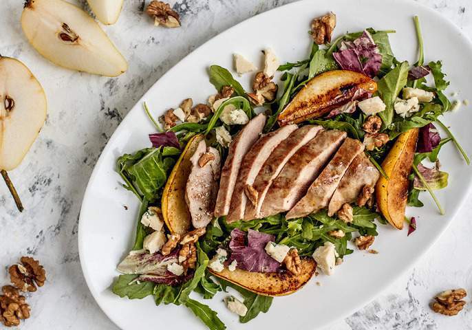 7. Выложите на салатное блюдо теплые кусочки утки, дольки груши, сверху раскрошите орехи и голубой сыр. Полейте салат заправкой. Такой салат будет вкусным как теплым, так и холодным.