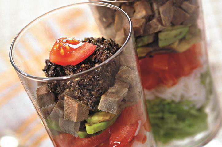 7. Разложите салат слоями в высокие бокалы, сначала салатные листья, потом рис, помидоры, авокадо и язык. Сверху на салат положите по две столовые ложки тапенада.