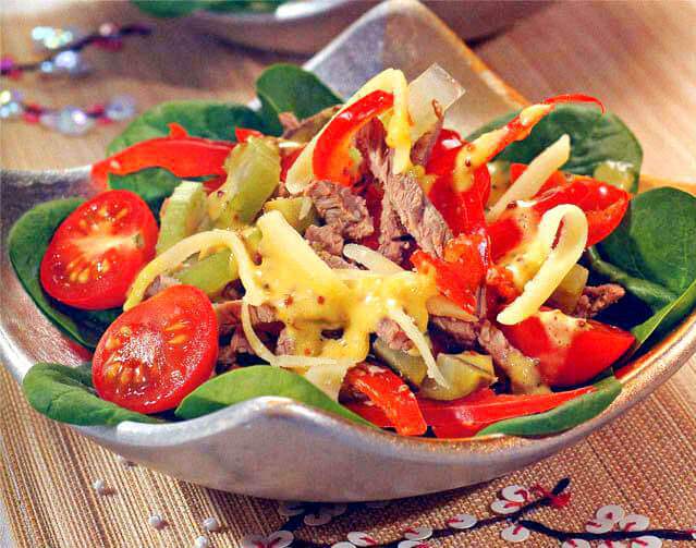 6. Перед подачей листья полевого салата вымойте, обсушите и выстелите ими дно салатника. На салат выложите настоявшийся в холодильнике салат с говяжьим языком и сладким перцем. Можно подавать к столу.