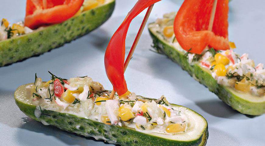 7. Наполните полученным салатом огуречные «лодочки». Сделайте «паруса» из ломтиков помидоров, одев их на зубочистки, и вставьте в салат каждой «лодки». Чтобы лодки с парусами были устойчивыми, срежьте снаружи немного кожицы у огурцов, сделав плоское дно.