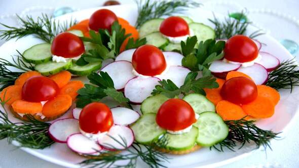 4.Творожный сыр намажьте на крекеры, а сверху уложите кружки овощей, которые будут изображать разноцветные лепестки цветочков. Дополните лепестки половинками помидоров черри, которые будут изображать сердцевину цветка.