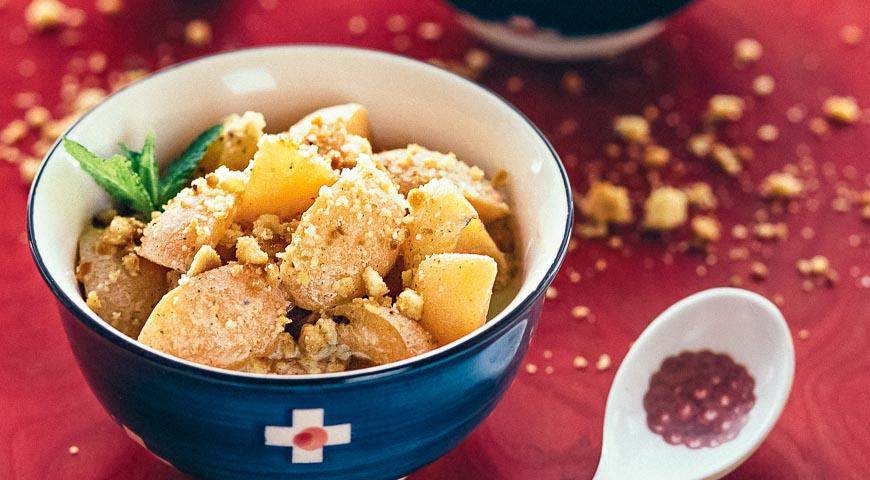 6. В сковороде или кастрюле с толстым дном растопите сливочное масло с добавлением сахара. Когда пенка на масле станет приобретать коричневый оттенок, всыпьте крошку печенья, добавьте молотую корицу, тщательно перемешайте.