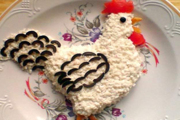 9. Из кусочков помидора вырежьте красный гребень и бороду, которые будут завершающими штрихами съедобной картинки. Детский салат «Петушок» готов к подаче на стол.