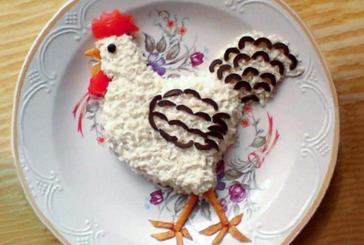 6. На широкой плоской тарелке выложите из салата туловище и голову. Мелко порубите белки, посыпьте ими туловище и выложите хвост.