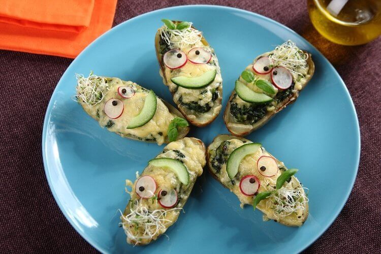 5.Нарежьте редис тонкими кружками и уложите на каждую половинку картофеля, изображая глаза с черными точками- зрачками (перец, кунжут или кусочки изюма). Горстка ростков будет Пану Картофелю шевелюрой, ломтик огурца улыбкой, листики базилика – бровями и (или) усиками.