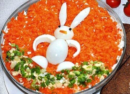 5.Яйца отварите вкрутую, остудите в холодной воде и очистите от скорлупы. На большое плоское блюдо выложите салат равномерным слоем и посыпьте сверху тертой морковью, создавая яркий фон.