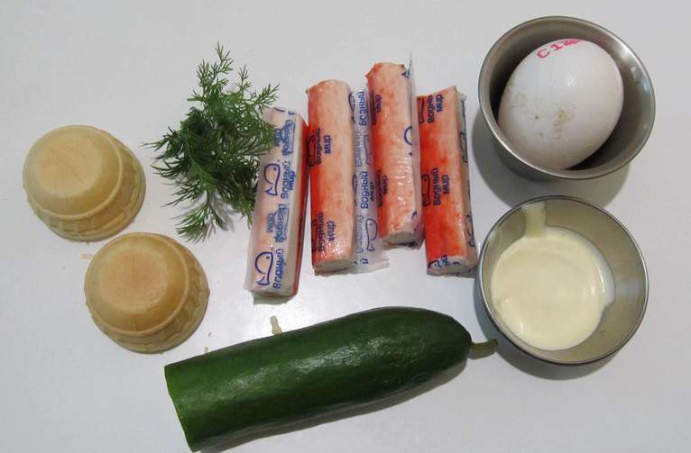 1. Для салата используйте готовые тарталетки, которые имеются в продаже в супермаркетах. Майонез лучше использовать жирный, от 60% жирности. С ним салат будет вкуснее. Огурец отберите с тонкой нежной кожицей, чтобы не пришлось очищать. Яйца отварите вкрутую и остудите в холодной воде.