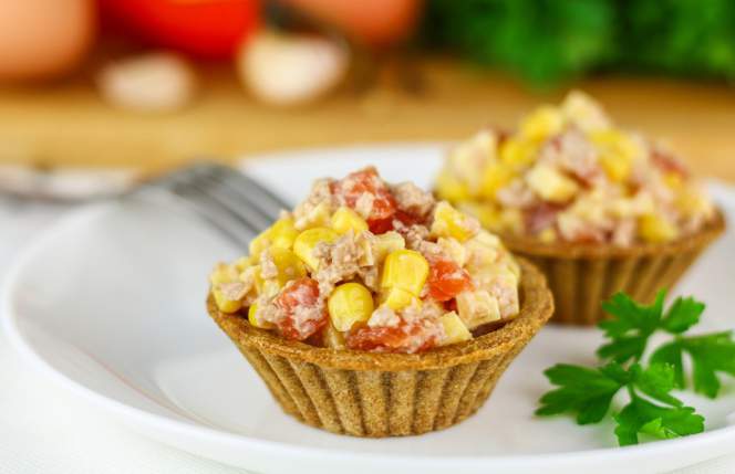 6. Осталось разложить готовую начинку в тарталетки. Накладывайте салат с небольшой горкой.