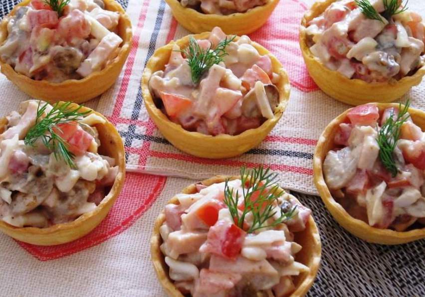 Планируя подавать салаты в тарталетках, подберите рецепты таких из них, которые были бы сочными, но не слишком влажными, чтобы корзиночки не размокли.