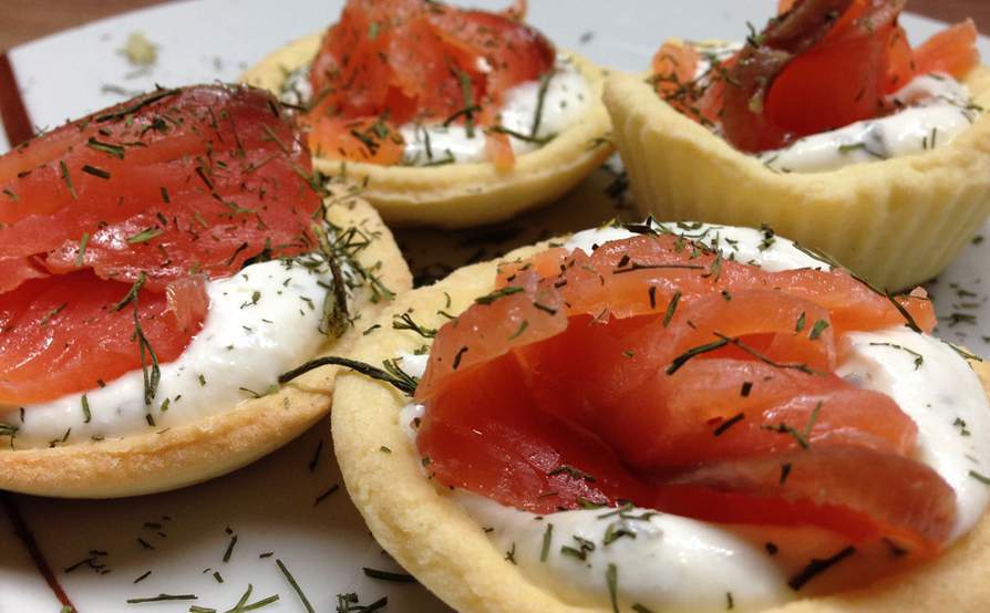 8. Салат с красной рыбой в тарталетках готов. Сложите тарталетки с начинкой на блюдо или поднос и подайте на стол.