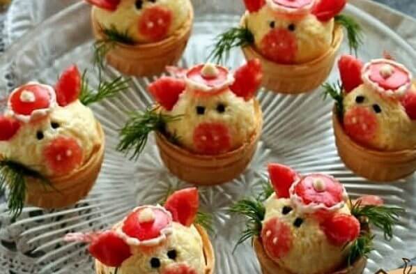 В преддверии Нового года под символом Свиньи, популярными для праздничного меню становятся блюда с ее символическим изображением. Если вы ищете креативные идеи блюд для Новогоднего стола, то попали по назначению. Предлагаем рецепт салата «Свинки» в тарталетках, приготовленного из плавленых сырков.