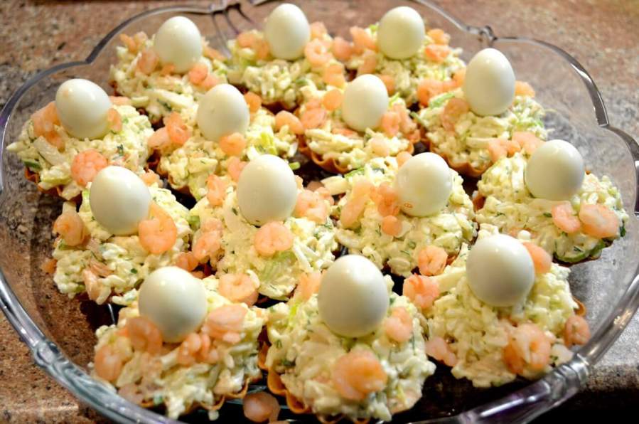 Готовим салат «Жемчужина» с морепродуктами в тарталетках