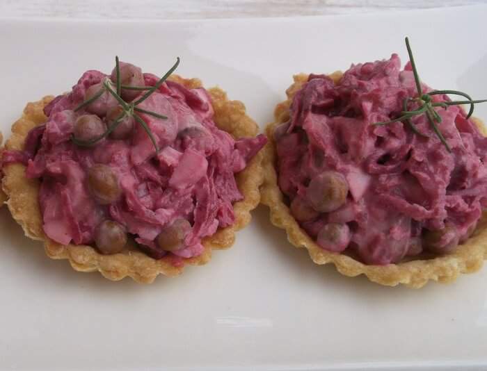 9. Селедочный салат со свёклой в песочных тарталетках готов. Подавайте его на стол сразу после приготовления.