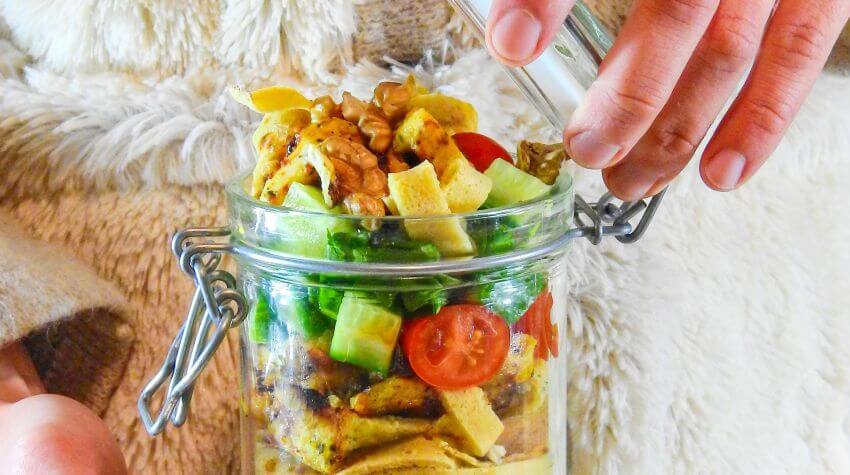 6.В банку или прозрачный салатник уложите салат слоями – блинчики, курица салат ромэн, помидоры, огурцы, грецкие орехи. Если у вас остались ингредиенты и место вверху посуды, повторите слои еще раз.