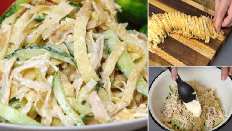 5. Куриное филе, которое успело остыть после запекания, разделите на волокна. Остывшие блины сверните все вместе рулетом и нарежьте в виде тонкой лапши.