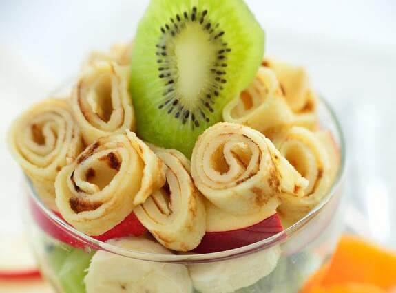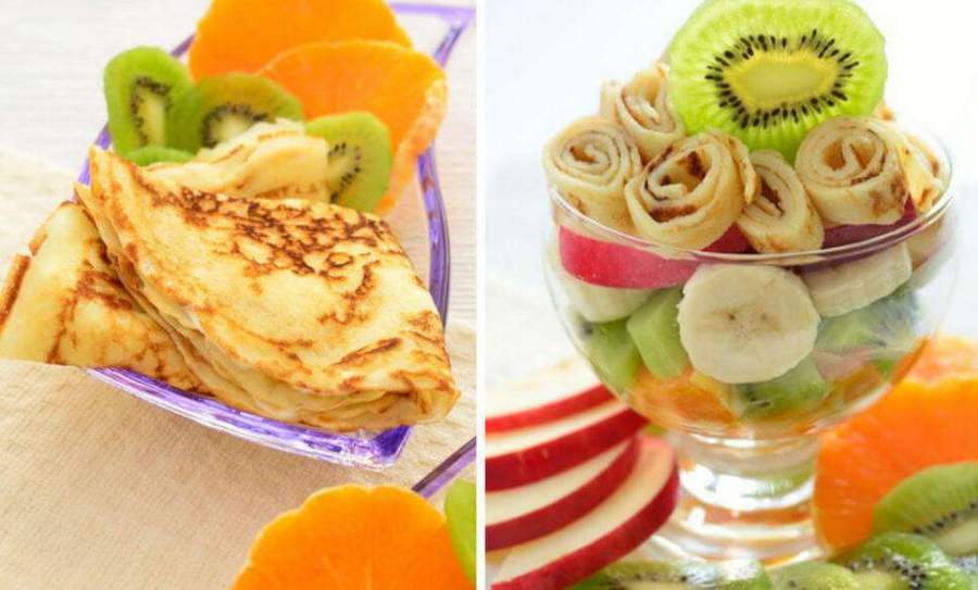 Блины вкусные в качестве самостоятельного блюда, но могут быть оригинально представлены как дополнение к другим продуктам. Отлично они сочетаются и с фруктами. Предлагаем вашему вниманию красочный и аппетитный фруктовый салат с блинами, который отлично подойдет как для завтрака, так и для десерта.