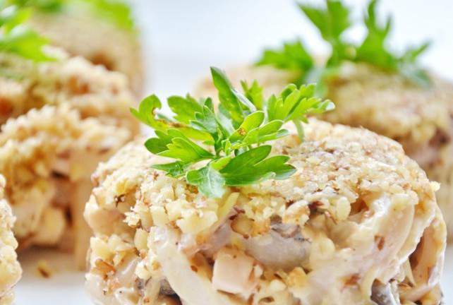9. Салат «Министерский» с блинами и курицей готов. Дайте ему немного пропитаться и подайте к столу, украсив зеленью.