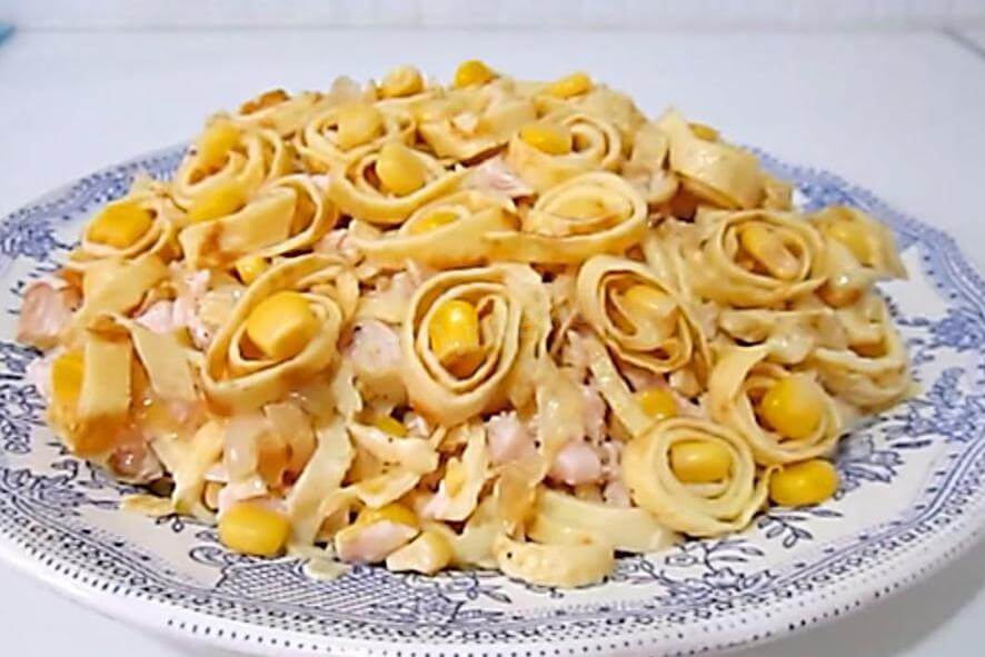 7.  Выложите приготовленный салат на блюдо в виде горки. Украсьте блинными спиральками и оставленными зернышками кукурузы.
