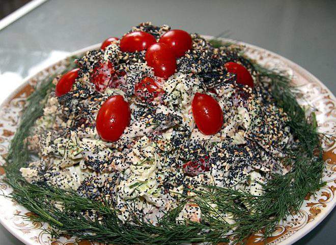 7. Полейте приготовленной майонезной заправкой и перемешайте. Добавьте соль, перец по вкусу и снова перемешайте. Выложите салат с блинами и мясом в виде купола на большое плоское блюдо. Посыпьте сверху кунжутом и маком. Украсьте помидорками и зеленью укропа.