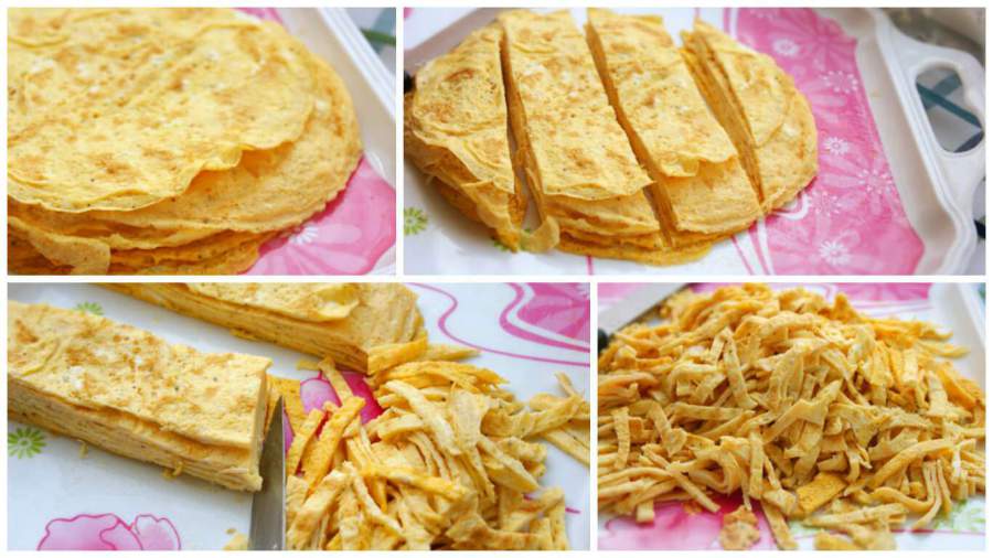 Чтобы быстро порезать яичные блинчики, предварительно их остудите. Затем сложите стопкой друг на друга и разрежьте на равные полосы с шириной около 3 см. Каждую полоску нарежьте поперек в виде тонкой соломки.