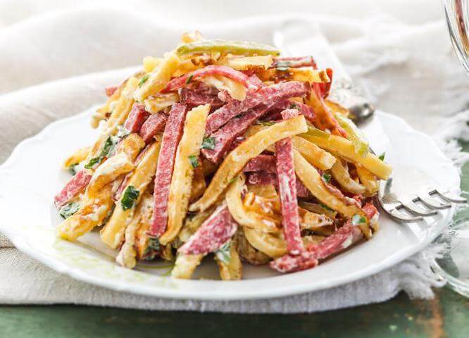 7. Быстрый и вкусный салат с блинчиками и колбасой готов. Вы можете подать его на блюде или разложить в порционные креманки.