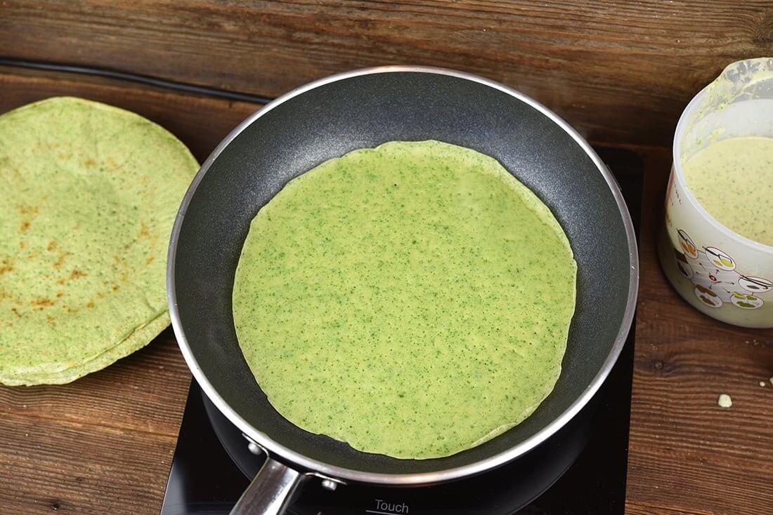 Зеленый цвет блинов получается в результате добавления в тесто мелко нарезанного шпината в качестве натурального красителя. Зеленая шпинатная начинка аппетитно дополняется курятиной, луком, чесноком и сыром фета и моцарелла для связки. Слегка поджаренные помидорки черри на основной зелени выглядят яркой вспышкой цвета и вкуса.