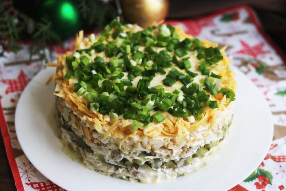 6.Слоеный салат с блинами, огурцами и курицей готов. Подавайте его к столу сразу после приготовления.