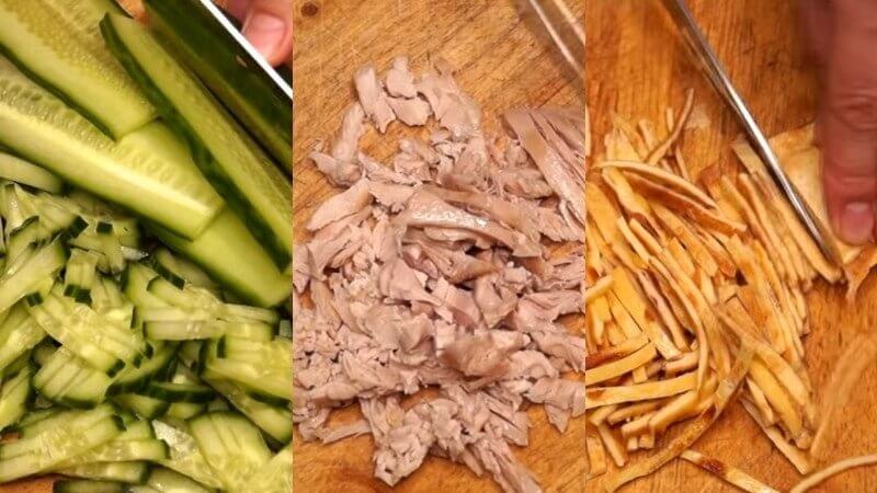 3.Лук репчатый очистите от шелухи, нарежьте мелкими кубиками и обжарьте на растительном масле до мягкости и прозрачности. Отварное куриное филе, свежий огурец и остывшие блины нарежьте соломкой.