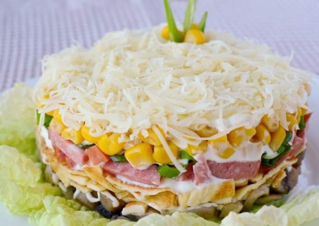 8. После настаивания слоеный салат с яичными блинами и колбасой можно подавать к столу.