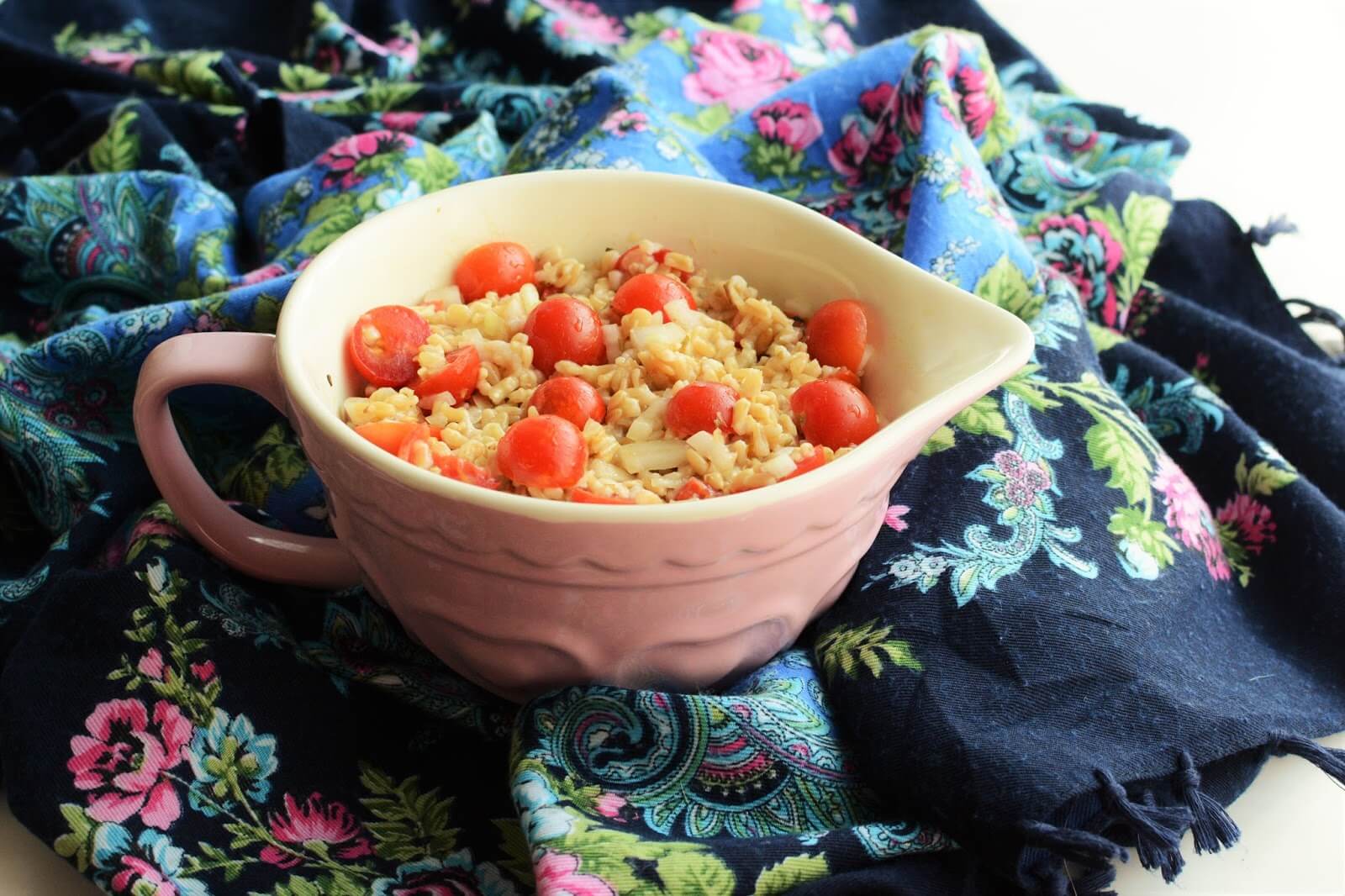5.Салат із перлової каші з помідорами готовий. Подавайте його до столу відразу після змішування, щоб нарізані помідори зайве не спливали соком. За бажання можете додати до нього пряні спеції, які вам подобаються. Але приправою орегано все ж таки не нехтуйте.