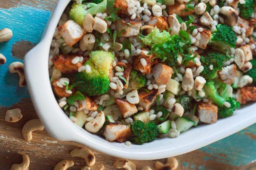 7.В большой миске смешайте крупу с курицей, кабачки и брокколи. Добавьте зелень петрушки и жареный арахис. Салат с перловой крупой и курицей готов.