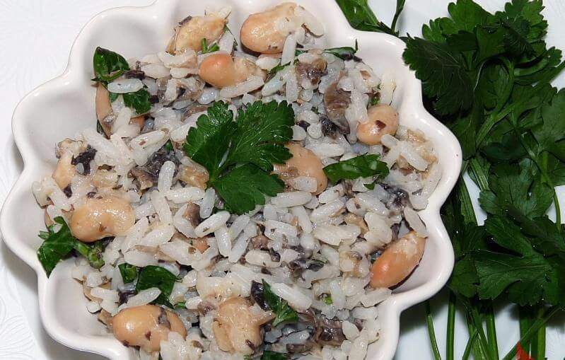 7. Добавьте к грибной массе отваренный рис, консервированную фасоль, измельченную зелень петрушки и майонез по вкусу. Тщательно перемешайте готовый салат.