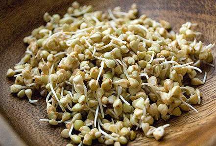1. Зеленую гречку нужно предварительно прорастить. Для этого залейте крупу водой на 4 чала или на ночь, потом промойте и переложите во влажную марлю. Еще через несколько часов появятся первые расточки, в таком виде пророщенную гречку можно употреблять.